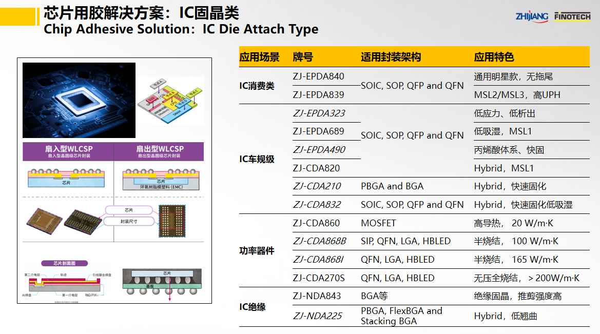 之江公司立足于中國膠粘劑行業領軍企業和有機硅、聚氨酯、環氧等專業膠粘劑的產業化優勢,具有國家級高新技術企業和國家級企業技術中心資質,依靠國家級CNAS實驗室以及國家級博士后科研工作站,并有國際專家助力,為半導體封裝行業提供高性能的芯片粘接和封裝解決方案。其中,關鍵產品如下: